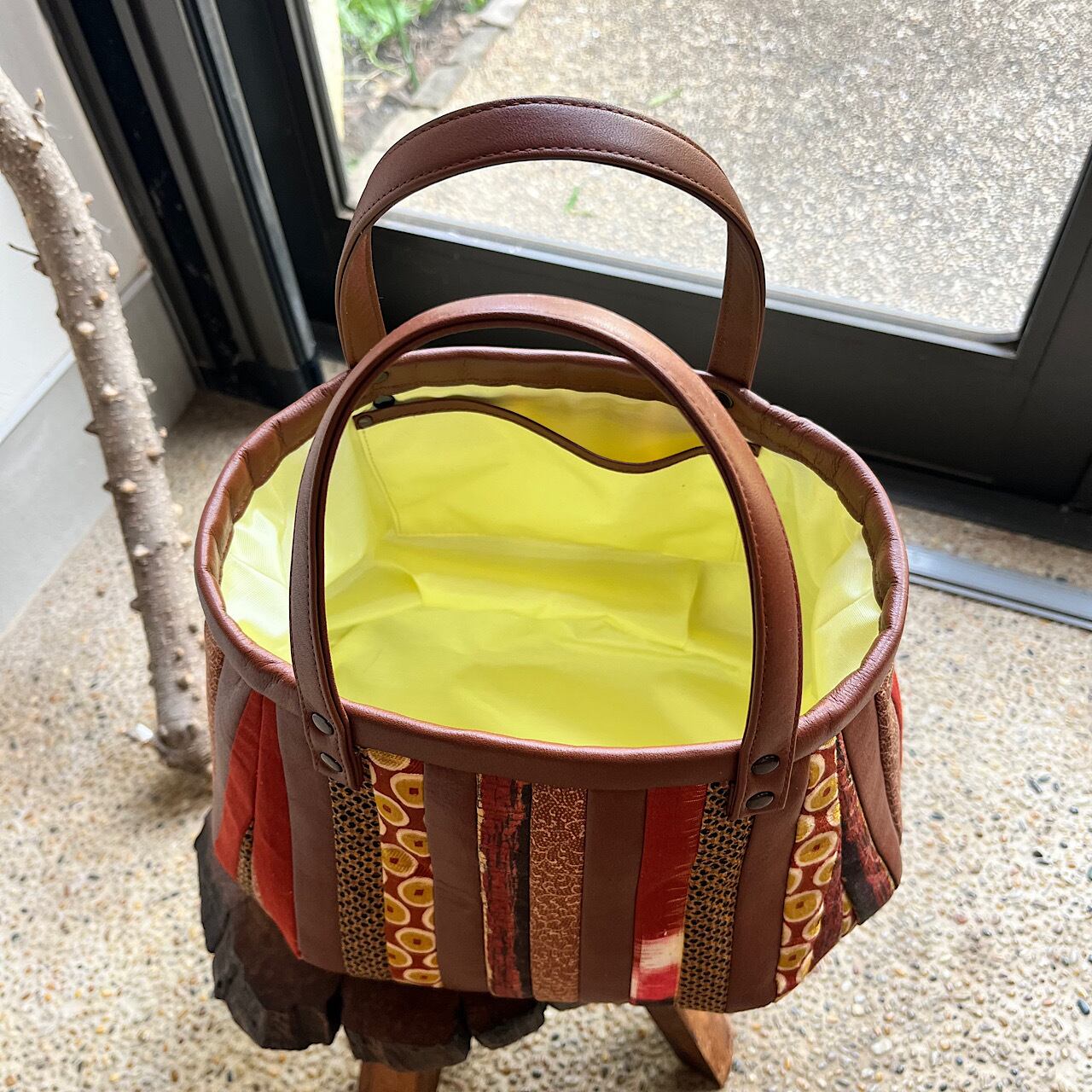 茶色の牛革と着物の古布と共にパッチワークをして作りました。