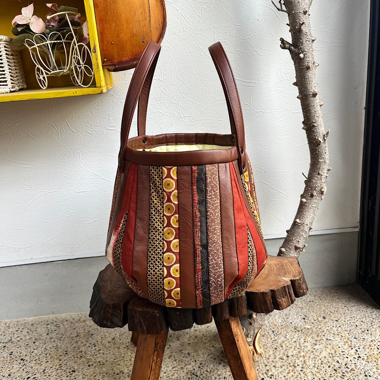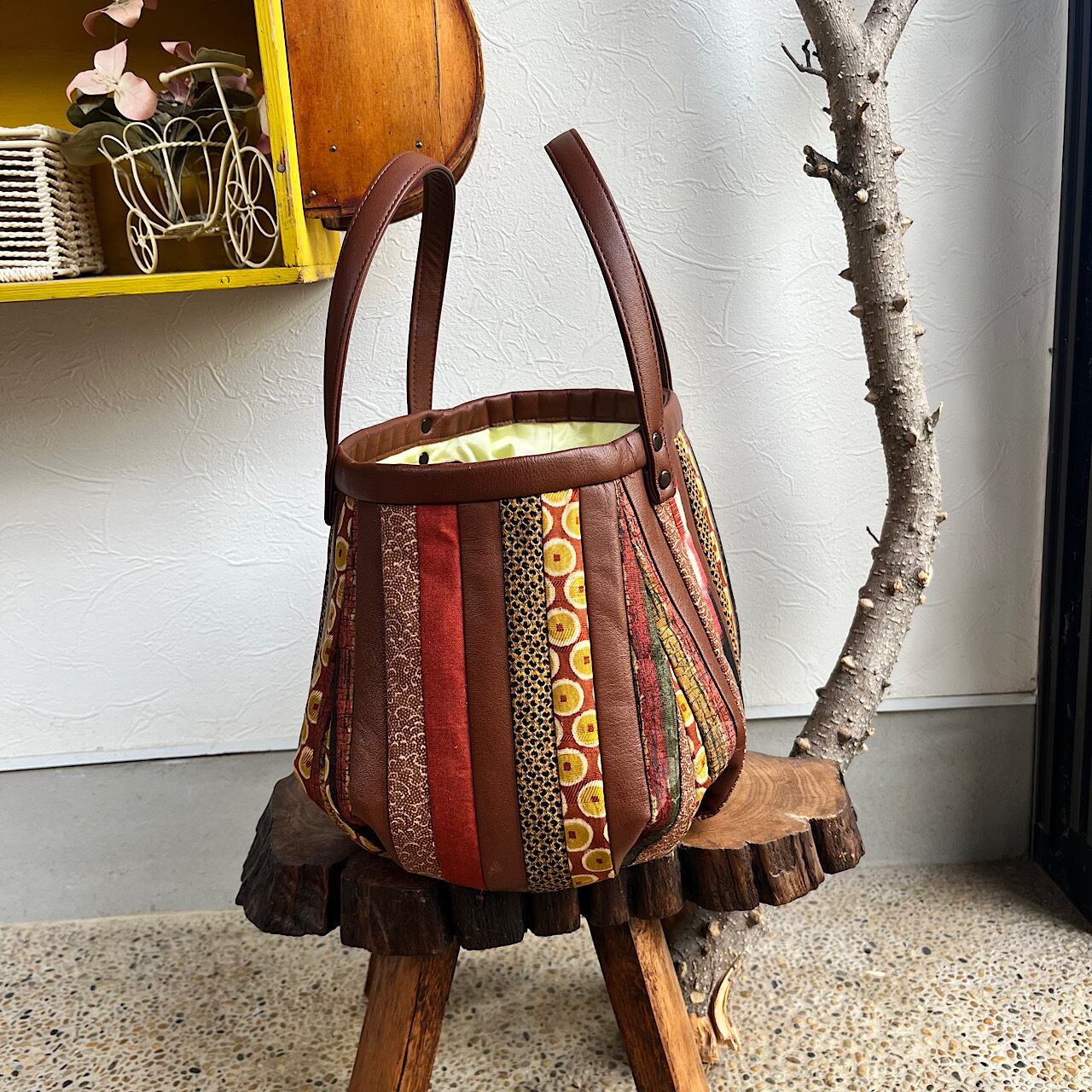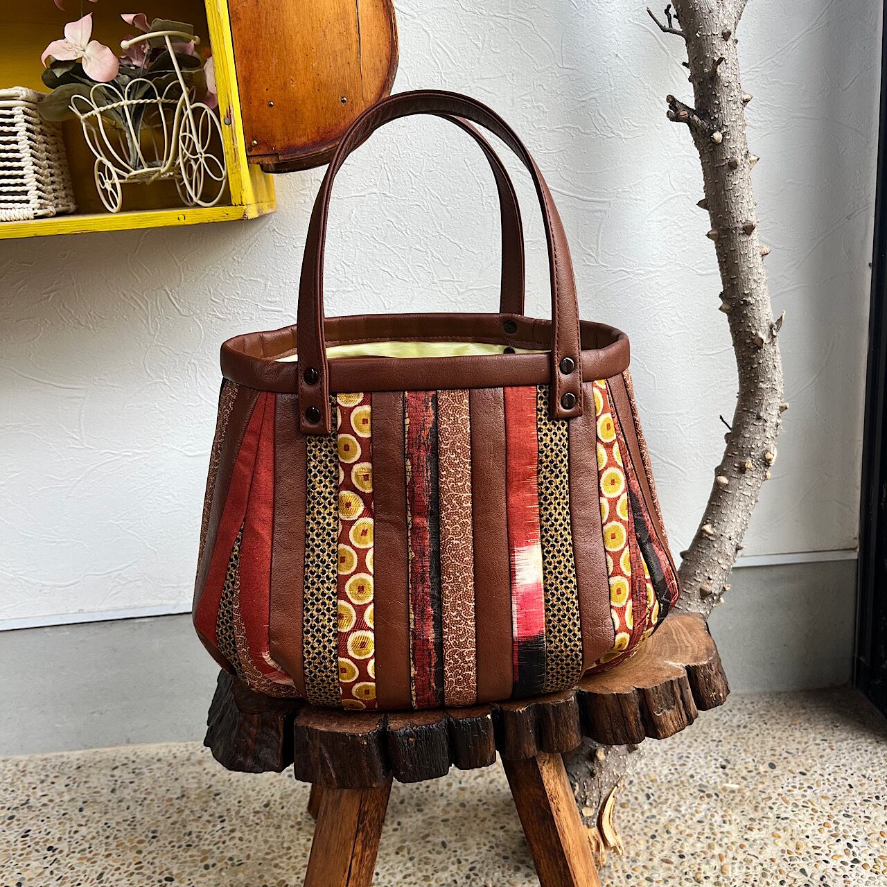 革と古布のパッチワークバッグ(ブラウンの革+着物生地)No.01016-81