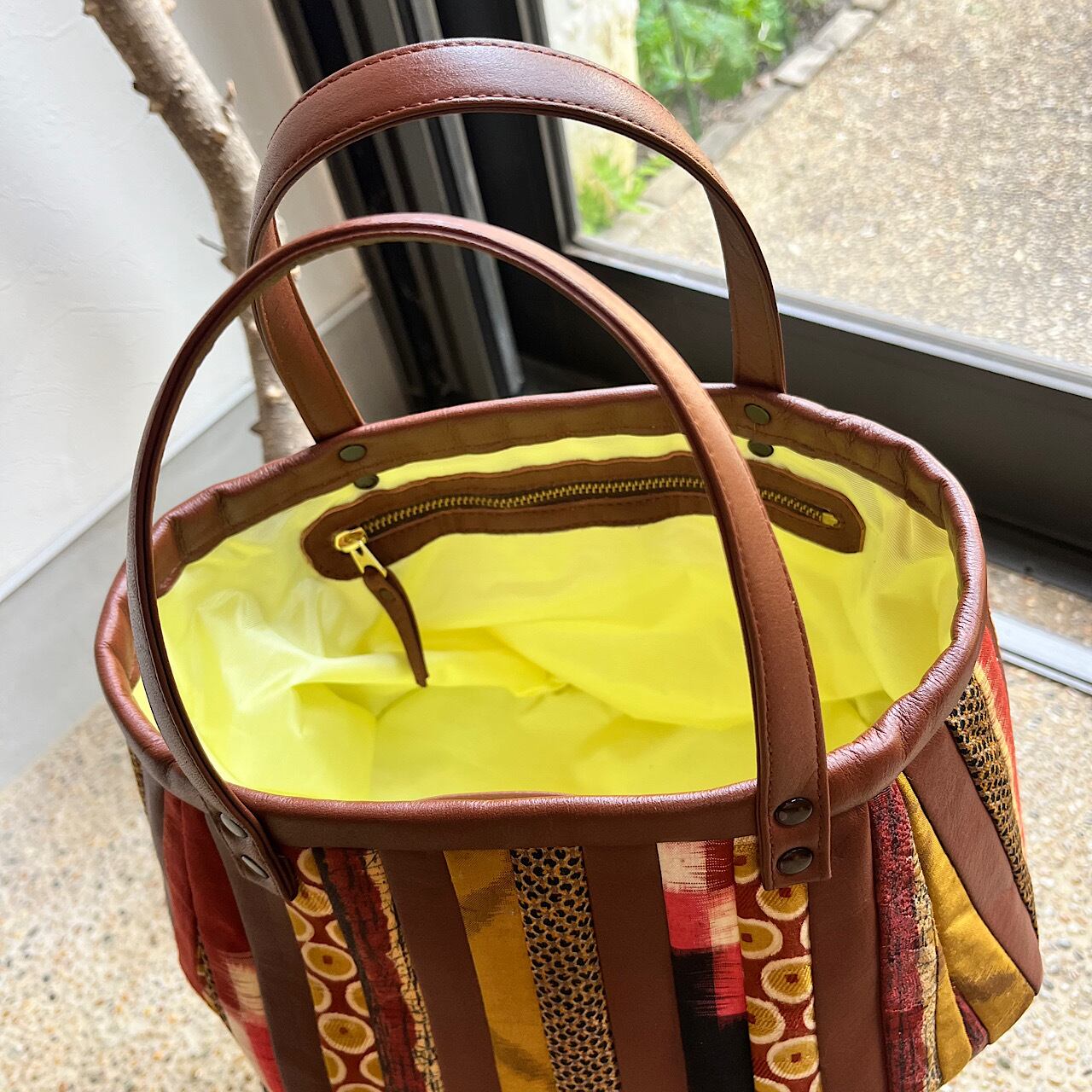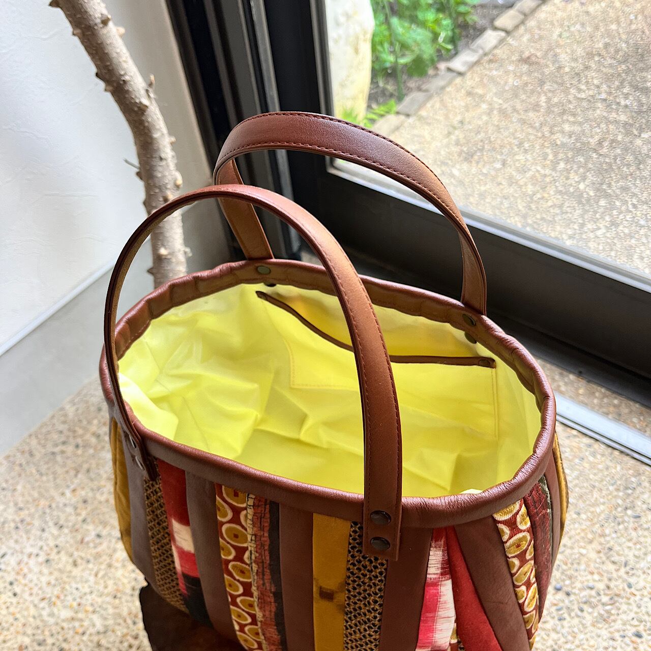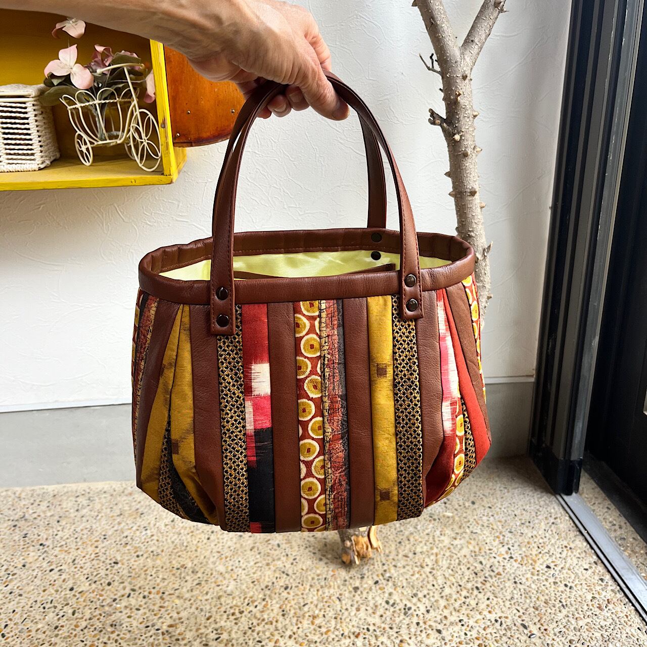 茶色の牛革と着物の古布と共にパッチワークをして作りました。
