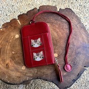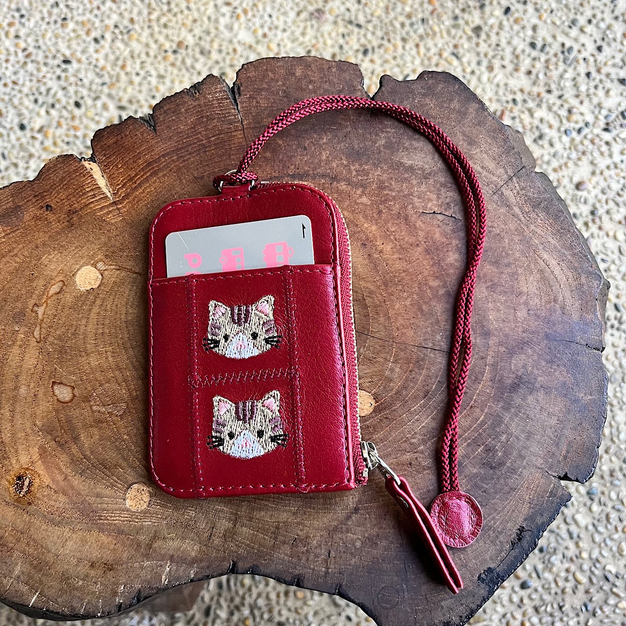 パスケース2枚用 小銭入れ付き(ワインレッドの革に茶トラ猫の刺繡)No.03003-41