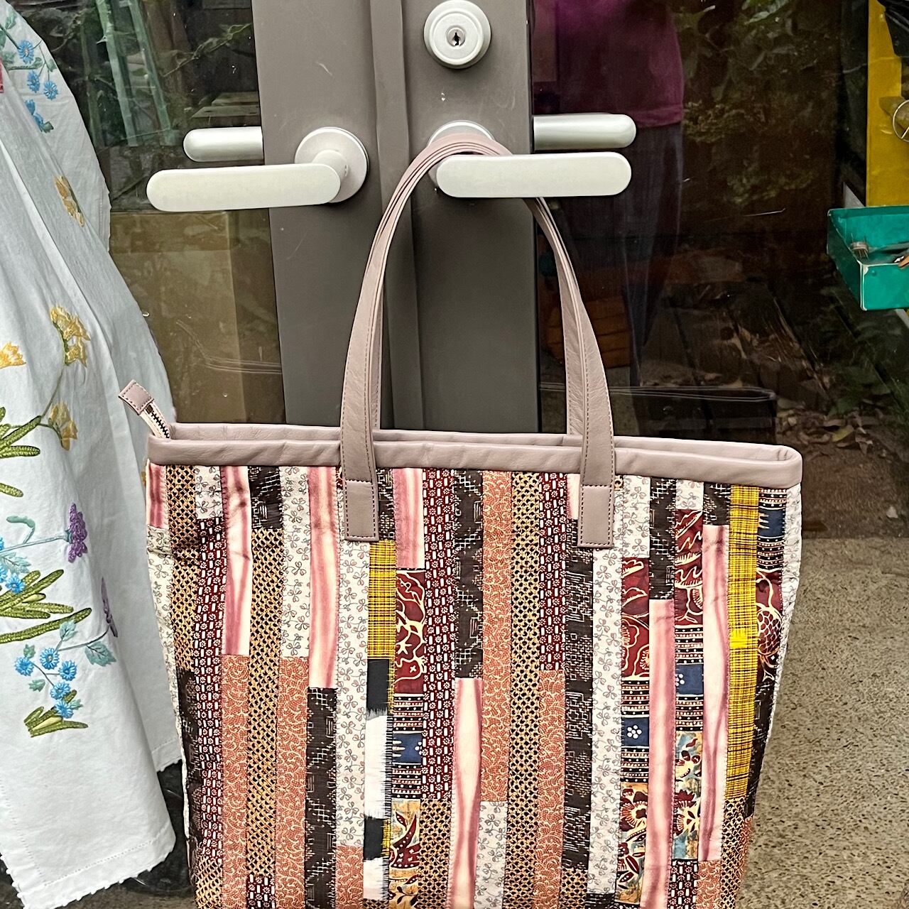 着物生地(古布)をパッチワークして牛革の持ち手を付けて作りました。