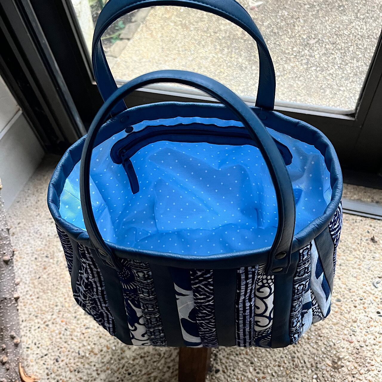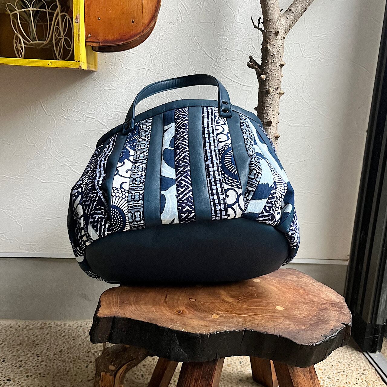 ブルーの牛革と木綿の浴衣の生地と共にパッチワークをして作りました。