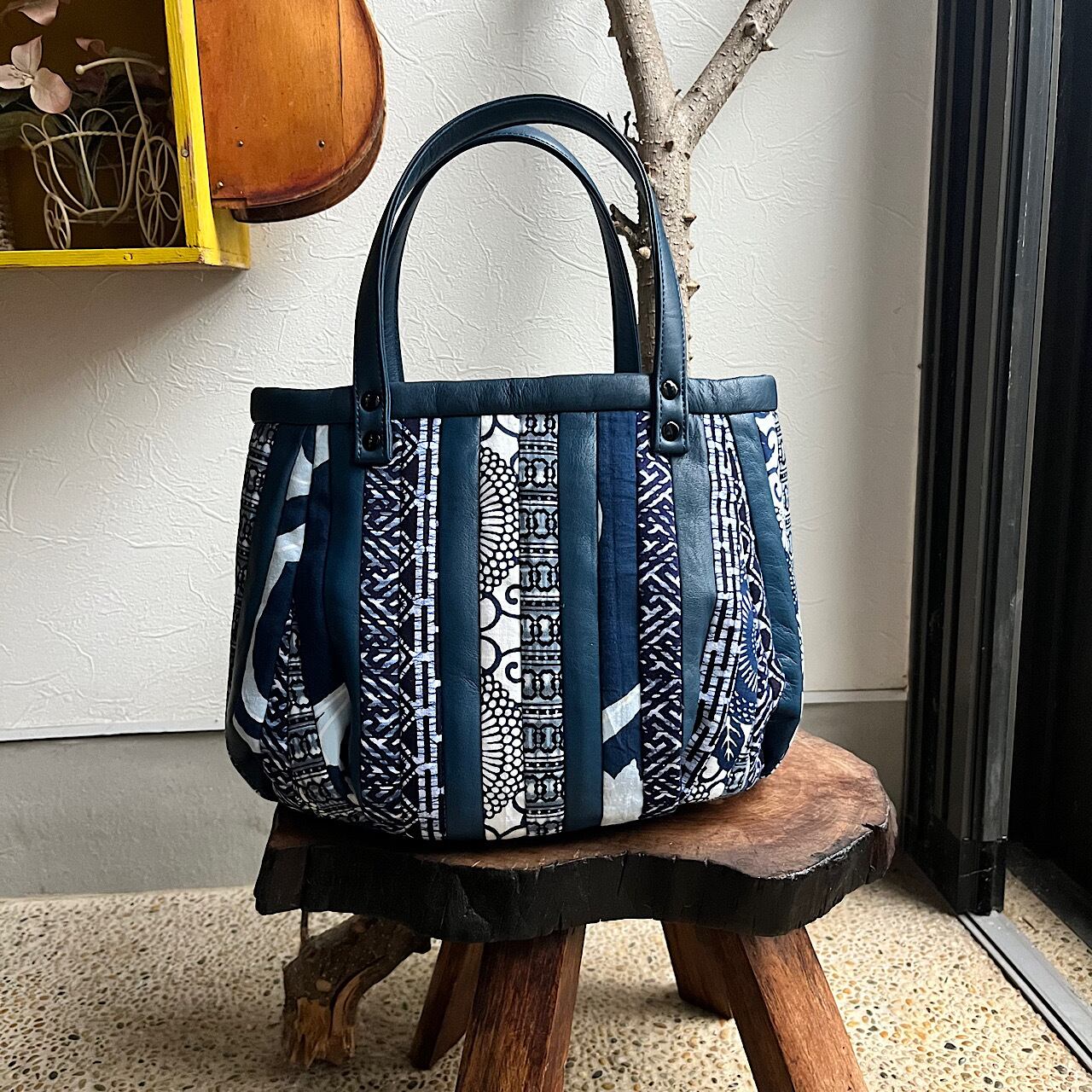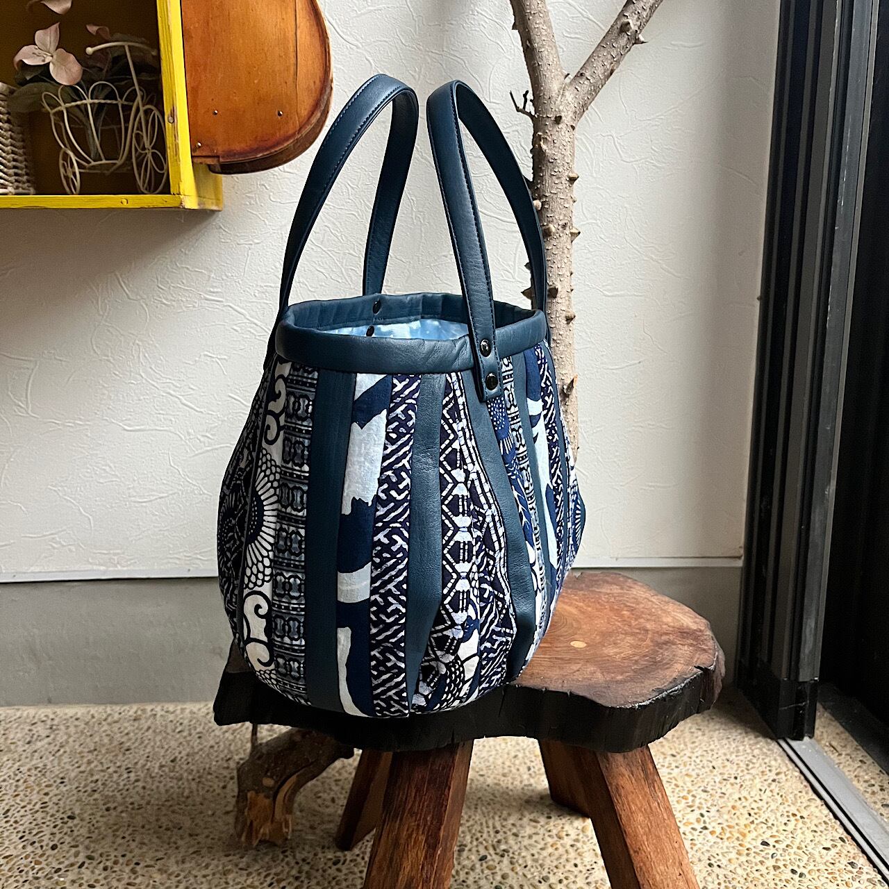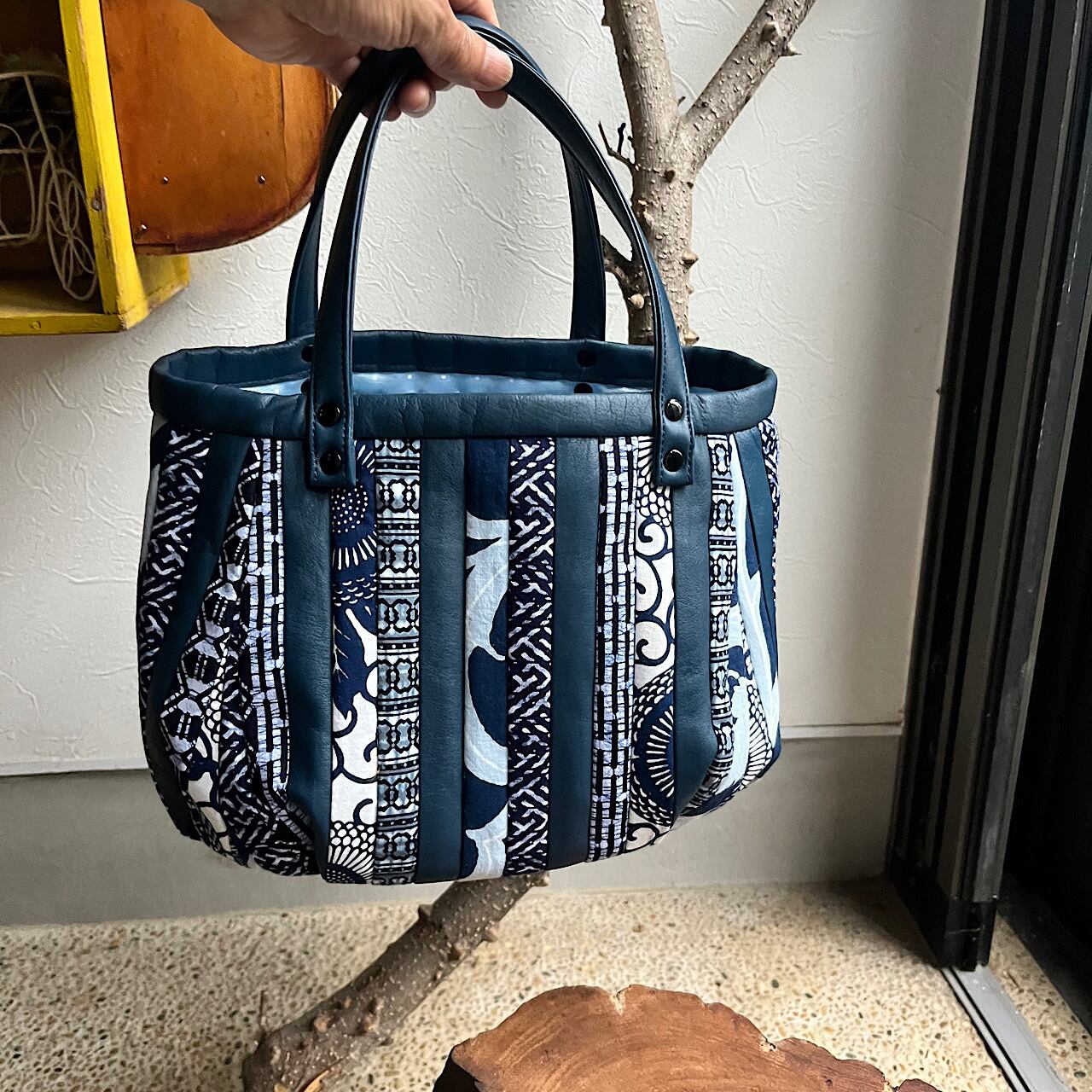 革と古布のパッチワークバッグ(ブルーの革+浴衣生地)01016-90