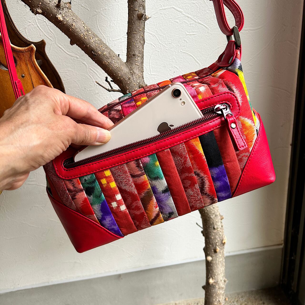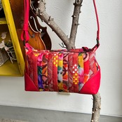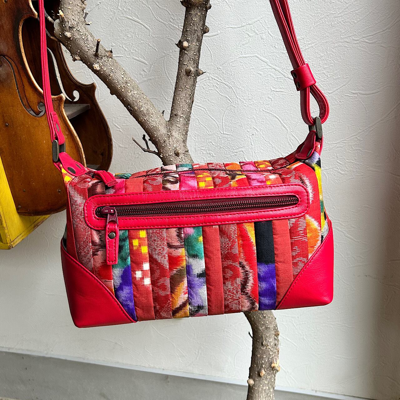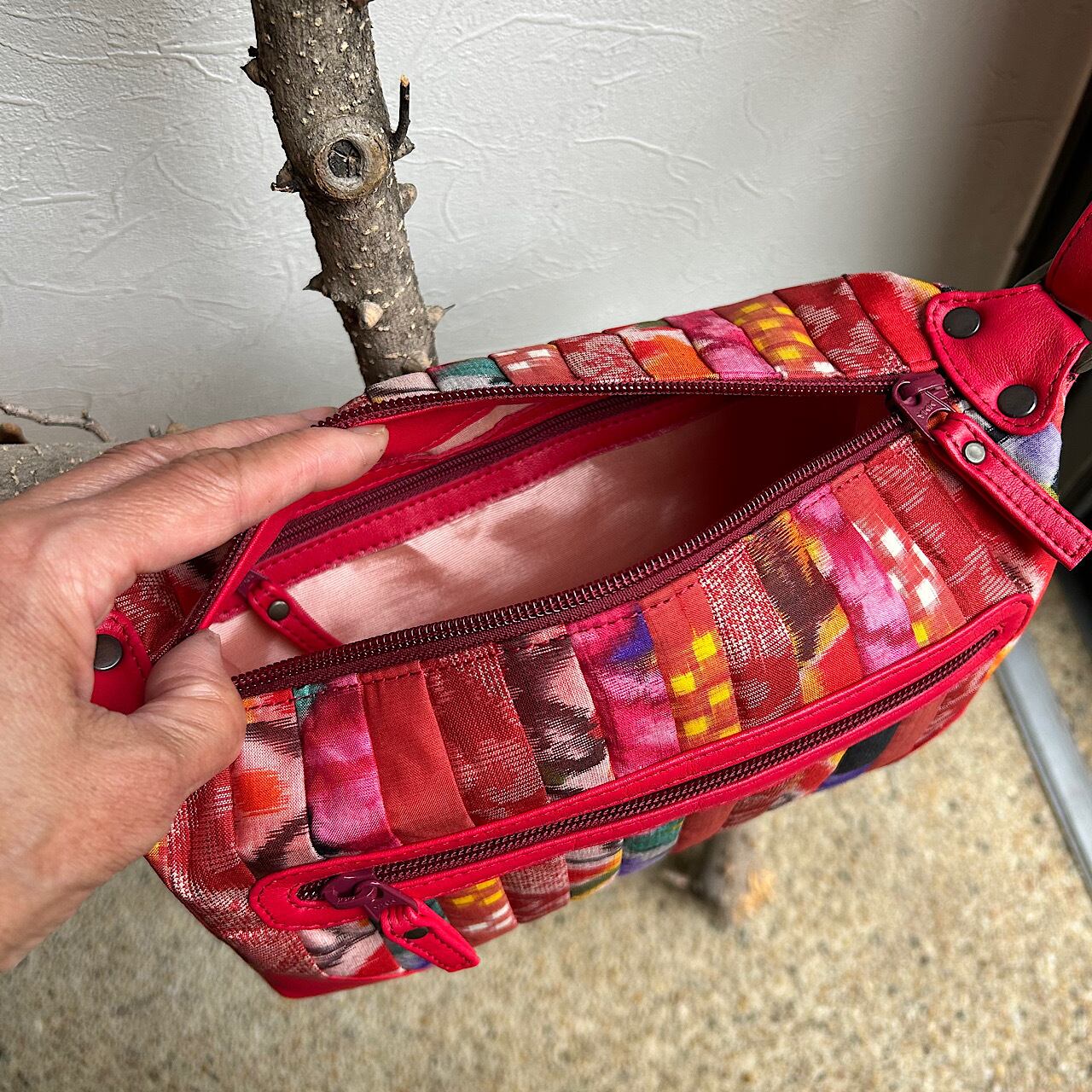 革と古布のパッチワークミニショルダー(赤の革+着物生地))01018-11