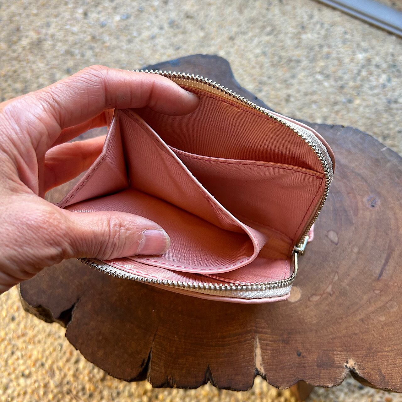 パールピンクの革に茶トラ猫の刺繡を施して 可愛いミニ財布が出来上がりました。