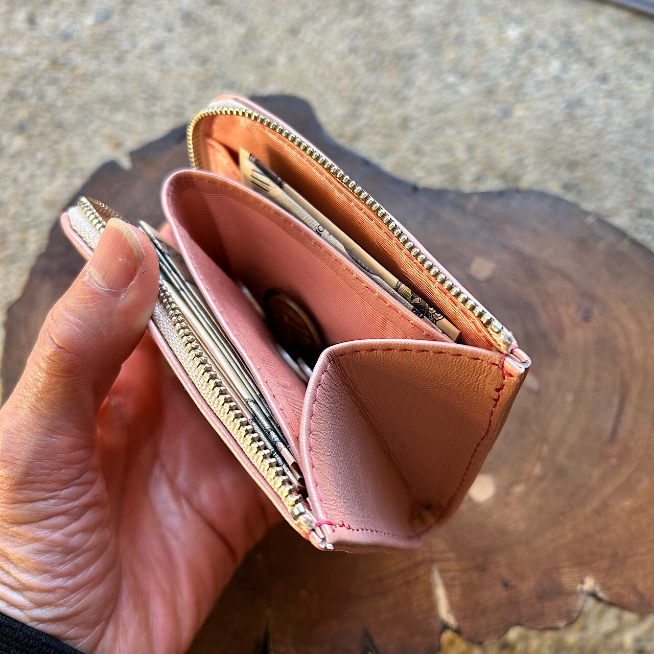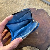中央が小銭スペース、その両側にお札やレシート、カードポケットは2か所。6~8枚目の画像は色違いのものですが、使用例です。
