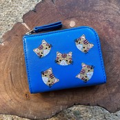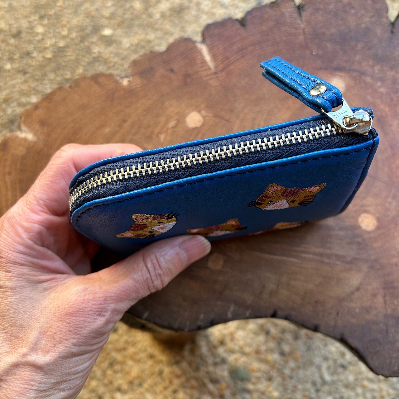 ドジャーブルーの牛革に茶トラ猫の刺繡を施して 素敵なコンパクト財布が出来上がりました。