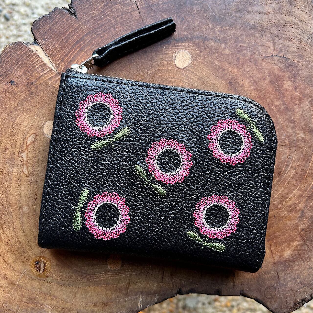 黒の牛革にかわいい花の刺繡を施して 素敵なコンパクト財布が出来上がりました。